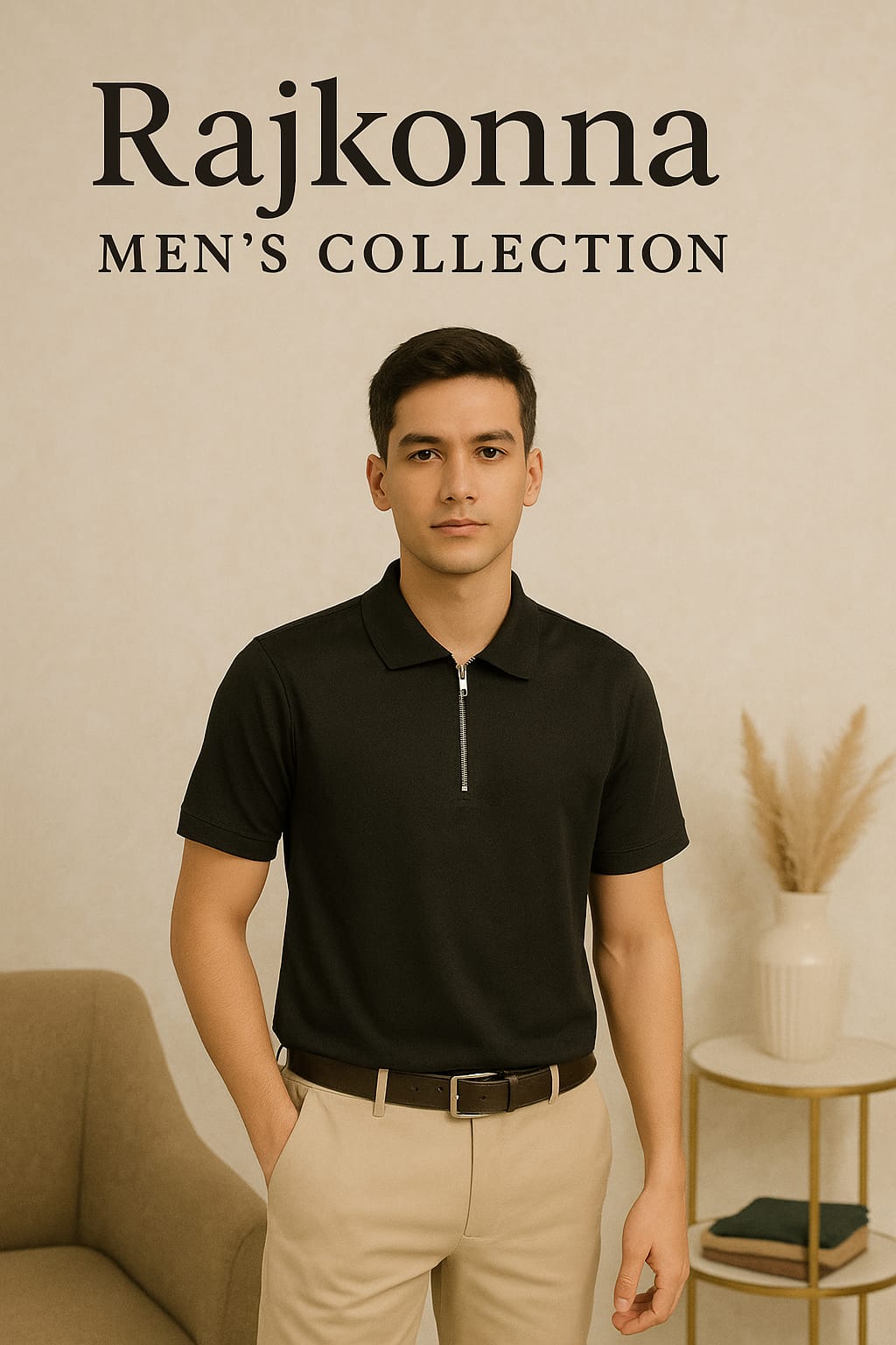 A timeless essential redefined with modern flair – the Rajkonna Men’s Classic Zipper Polo Shirt in bold black is perfect for both casual and semi-formal wear. Crafted with a soft, breathable fabric and detailed with a sleek half-zip collar, this shirt combines comfort, confidence, and effortless style. Ideal for office casuals, smart weekend looks, or dinner dates.