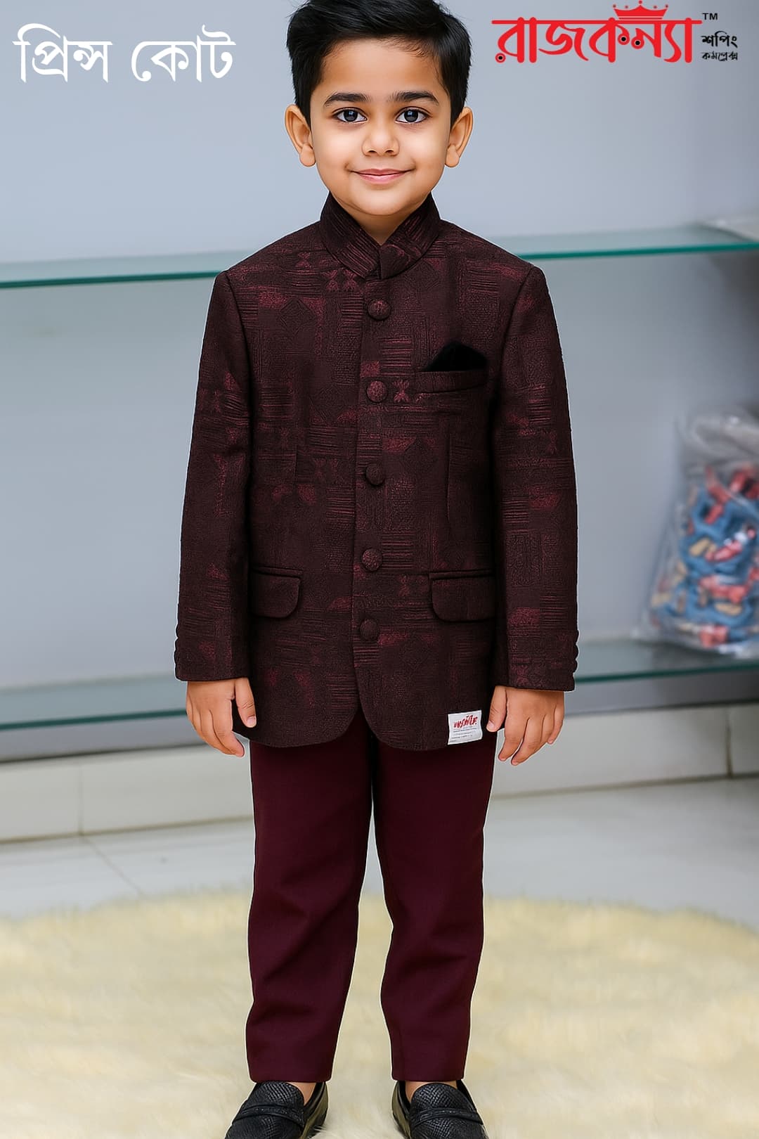 Let your young one shine in timeless sophistication with this Boys’ Royal Prince Coat Set in classic black, proudly presented by Rajkonna Shopping Complex. Designed with regal charm and modern tailoring, this outfit features a textured black prince coat with a bandhgala collar, matching pants, and a rich maroon pocket square that adds a luxurious touch. Perfect for weddings, receptions, formal events, and celebrations.
