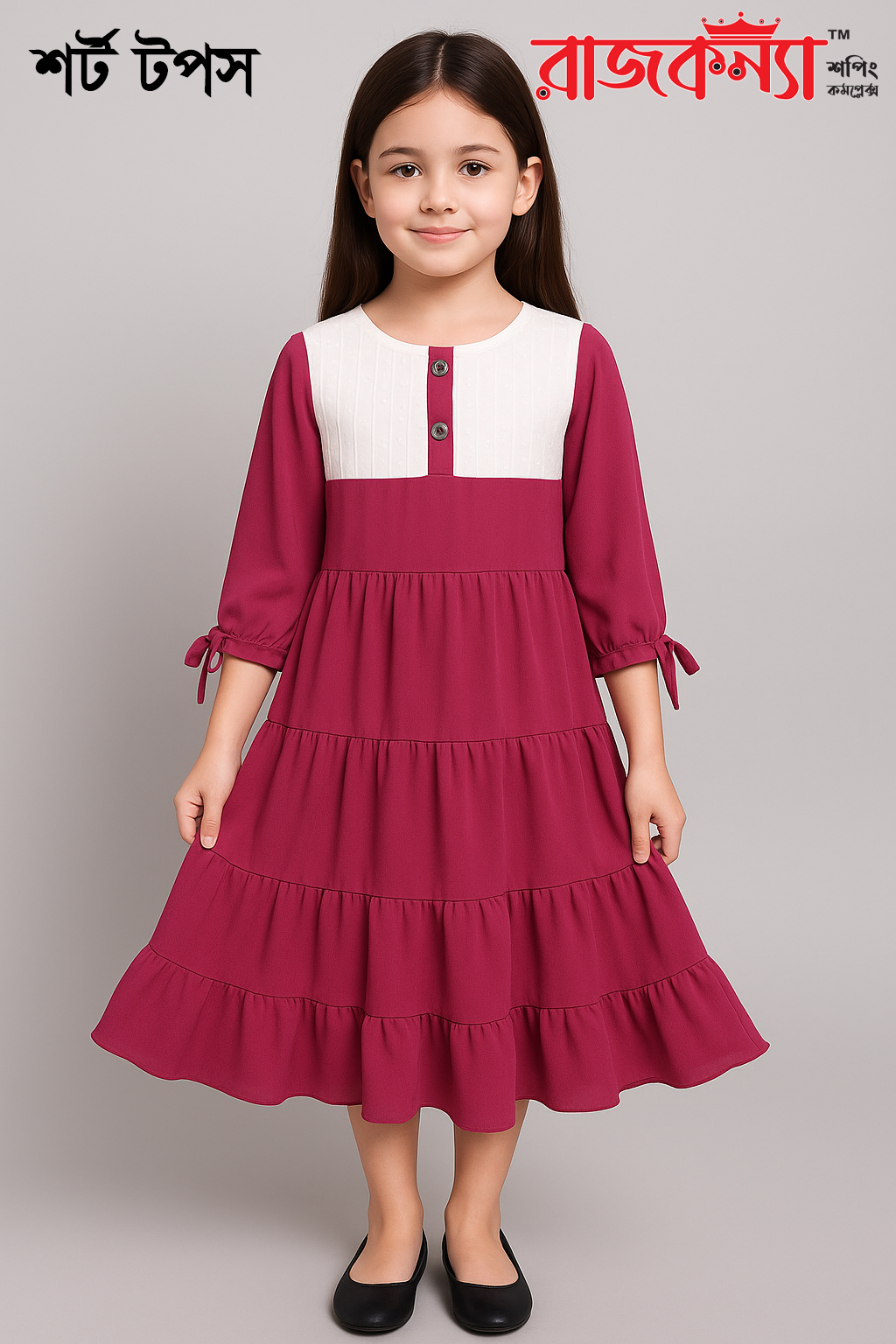 This elegant and adorable frock is perfectly designed for 13-year-old girls. It features a white embroidered yoke with two stylish front buttons that add a touch of charm and sophistication. The deep pink/maroon body with three soft, flared layers creates a beautiful and graceful silhouette.